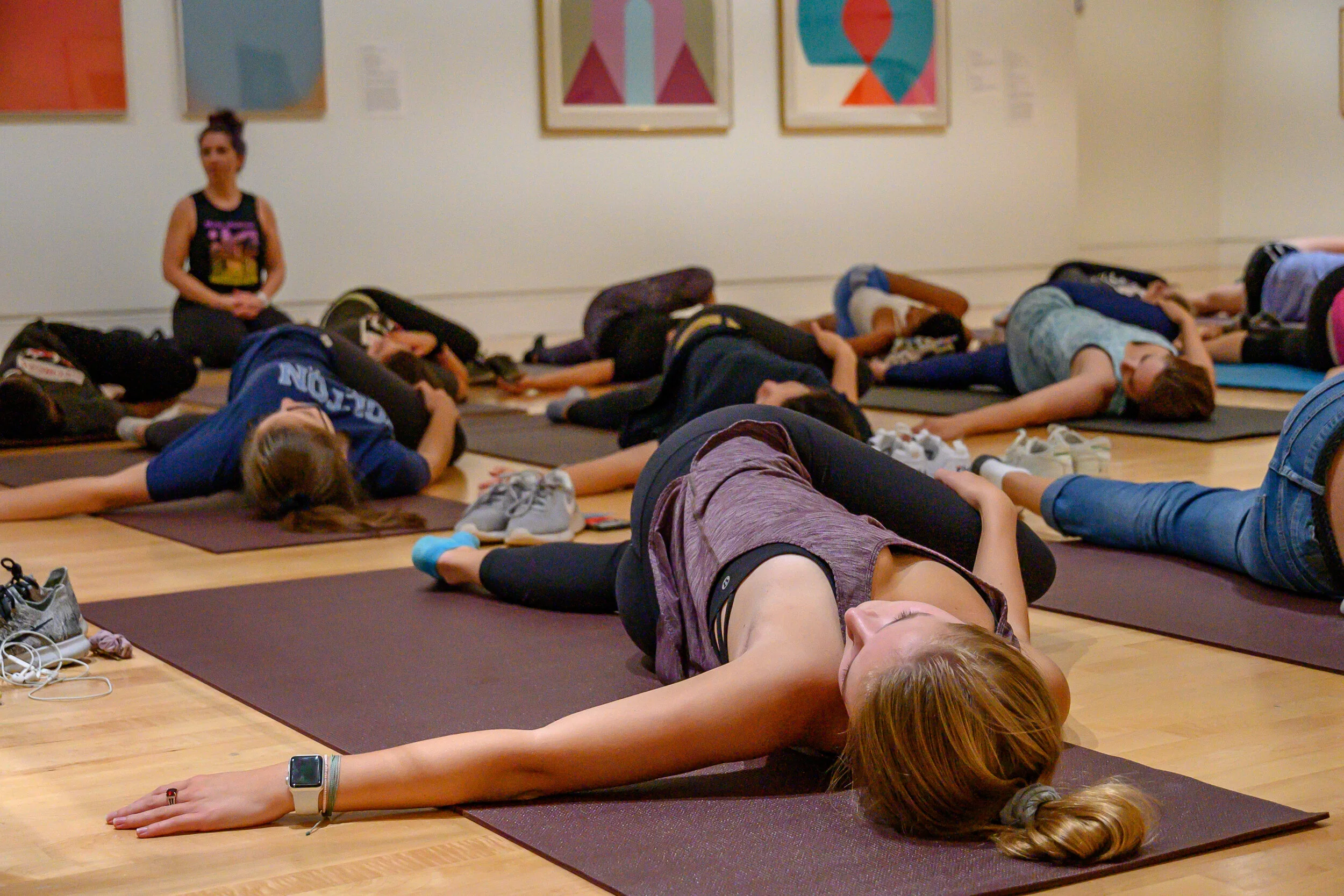 Instructor SJ Ursrey leads Yoga in the Galleries on Sept. 19 at the Georgia Museum of Art. This free event is part of the monthly Third Thursday art event in Athens, Georgia, which encourages the public to experience local art.